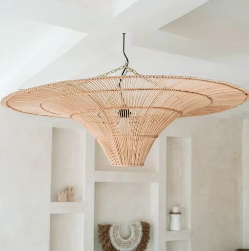 Add elegance and authenticity to your interior with this magnificent boho-chic rattan and bamboo lamp. Its natural structure of finely woven leaves creates a warm play of light that instantly transforms the ambiance of the room. The lamp is available in different sizes, from 60 to 150 cm in diameter, and fits perfectly in a…