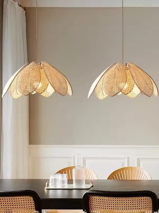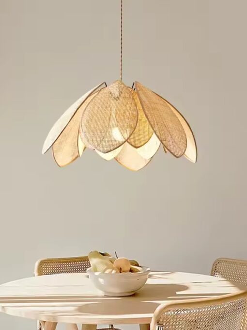 he large Petal pendant lamp in woven rattan creates a dramatic effect. The large woven rattan petals add a sophisticated bohemian touch and diffuse a soft light that changes the mood of the room. With its impressive dimensions of Ø26 x H13 nches, it is ideal for embellishing a large dining table, a spacious living…
