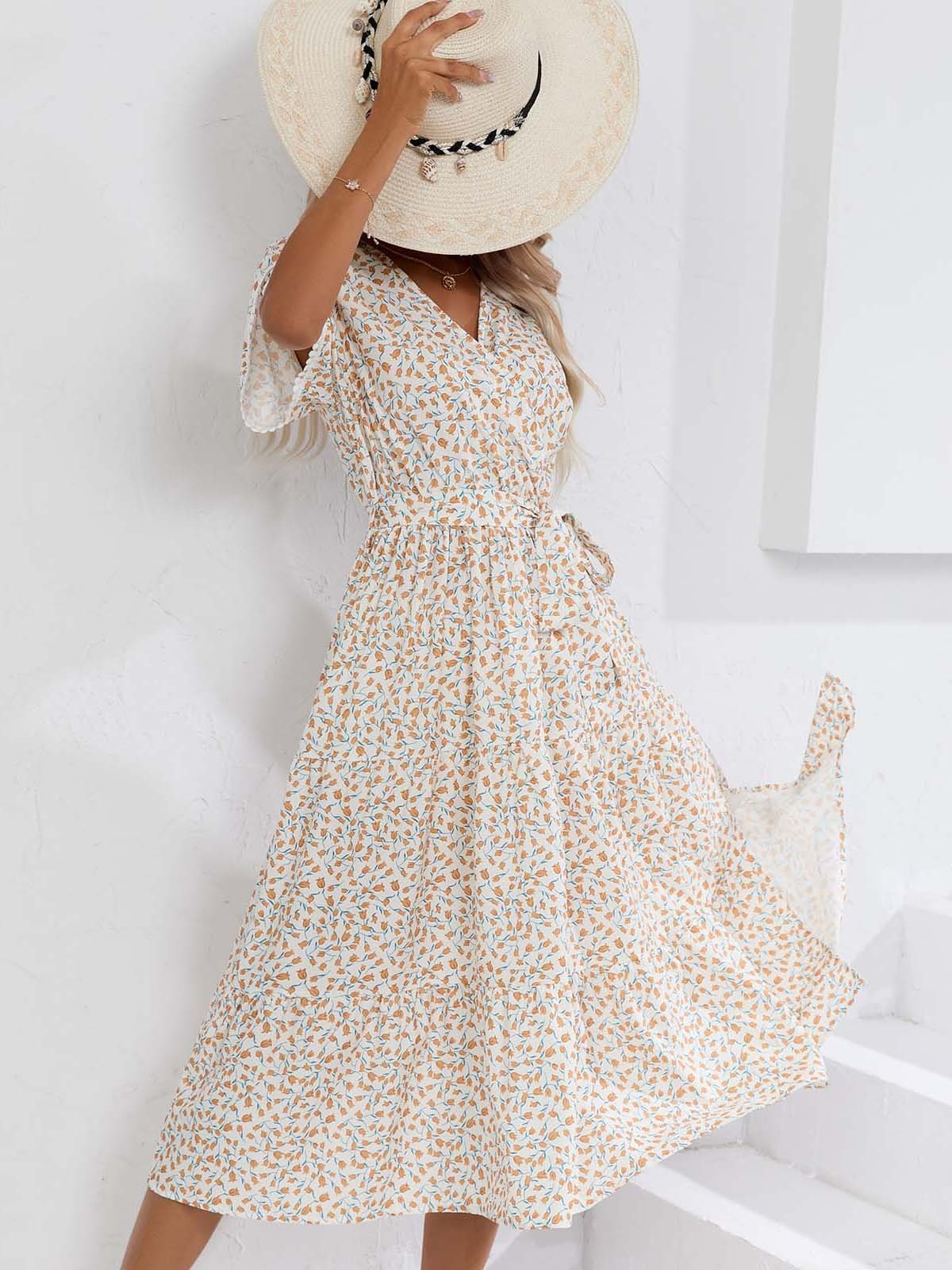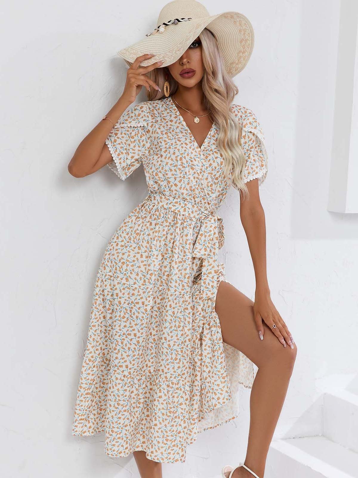 The yellow color and the floral motifs give the dress a spring touch. The flared cut, narrow at the waist and slightly asymmetrical, enhances you and your legs. The V-neckline, the short sleeves and the thin knotted belt add a bohemian touch to this dress.