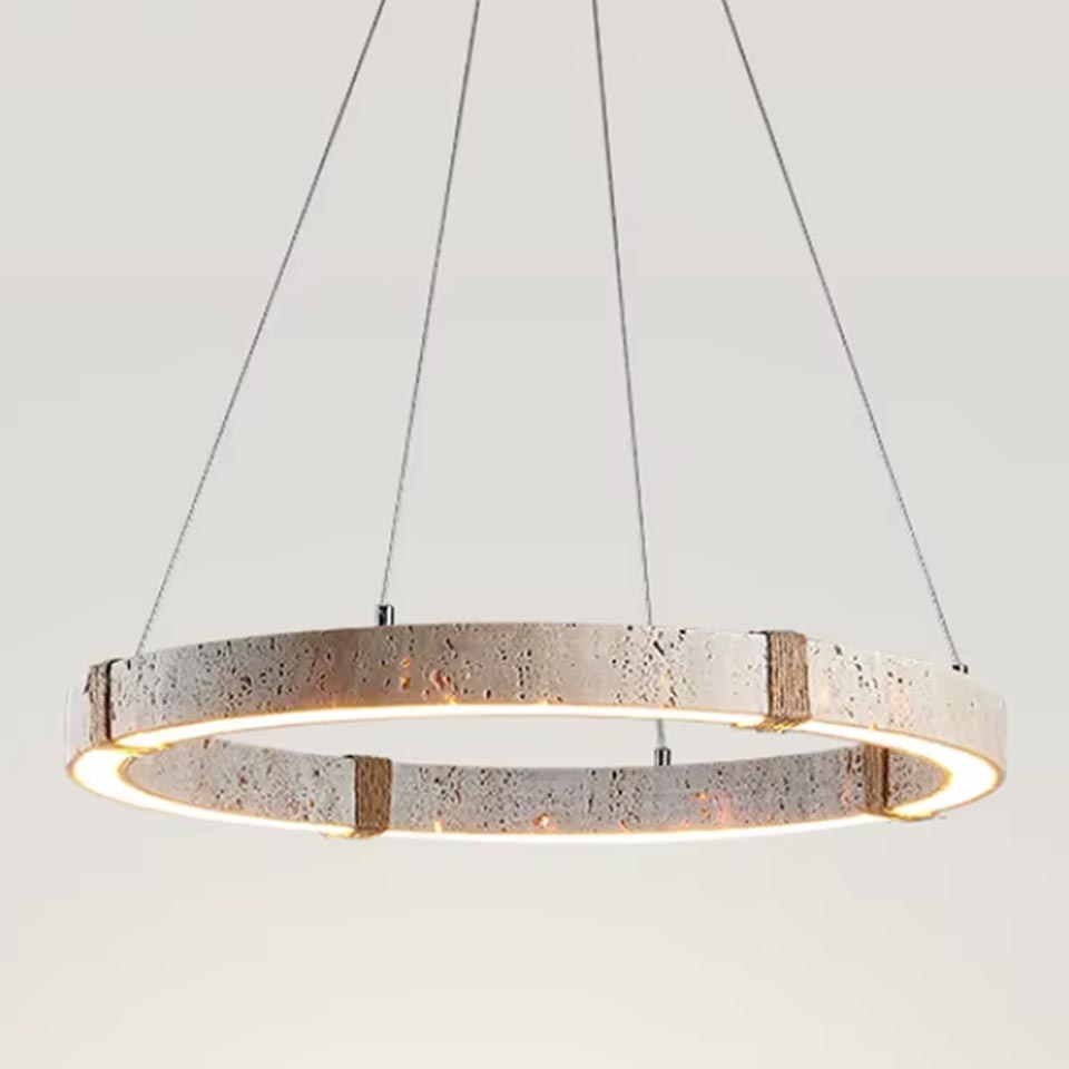 With its impressive 23 inches diameter, this natural travertine chandelier will be the centerpiece of your decoration. The 1.5 inch high stone ring sublimates the light and reveals all the richness of travertine, bringing elegance and character to your interior.