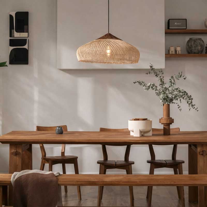 Bring a warm and natural touch to your home with this 24 inches diameter woven rattan pendant lamp. The perforated weave gently diffuses light and creates a beautiful play of shadows, perfect for creating a cozy and relaxing atmosphere.