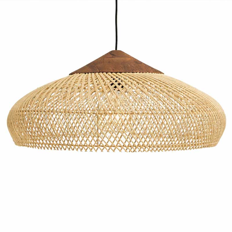 The large natural rattan shade is topped with a wooden cover, which accentuates the bohemian style of the lamp and blends into a modern, Scandinavian or ethnic setting. Ideal over a dining table, in the living room or bedroom.