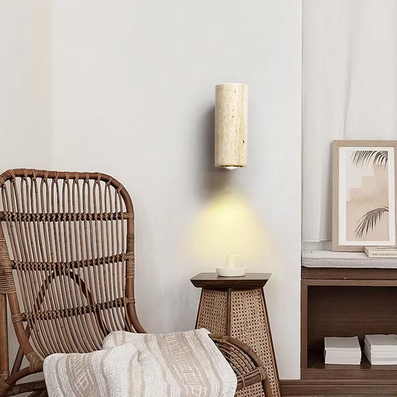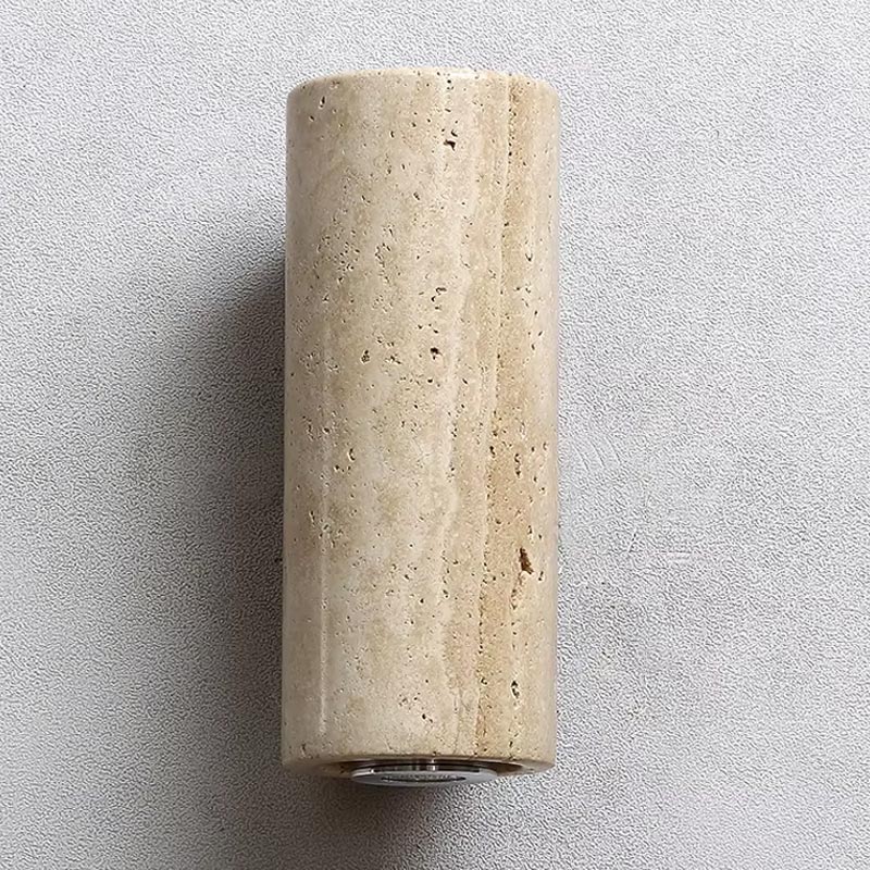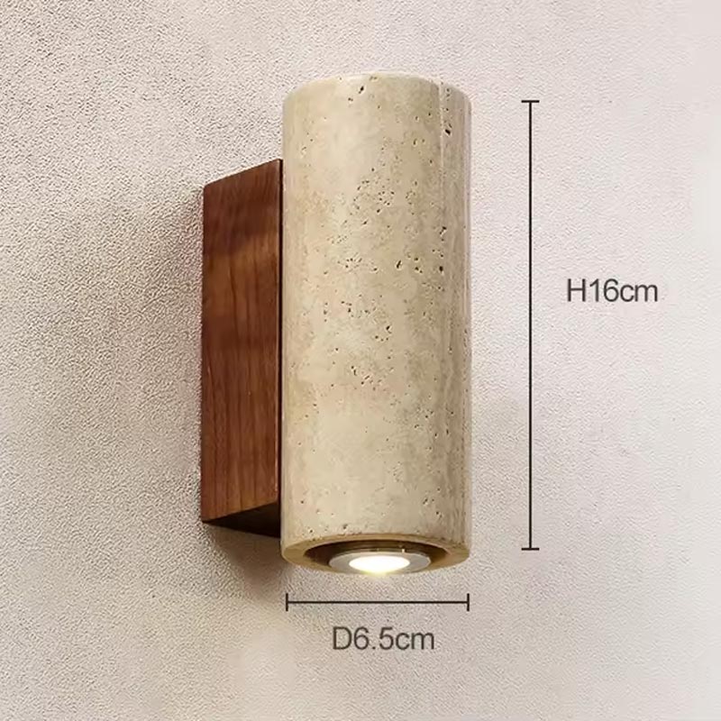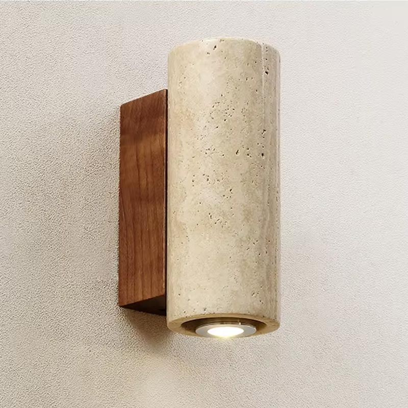 Bring a sophisticated bohemian touch to your home with this travertine and wood wall sconce. Its cylindrical design combines the elegant character of natural travertine with the warmth of wood, creating an authentic, minimalist and timeless effect.