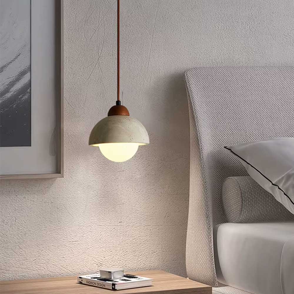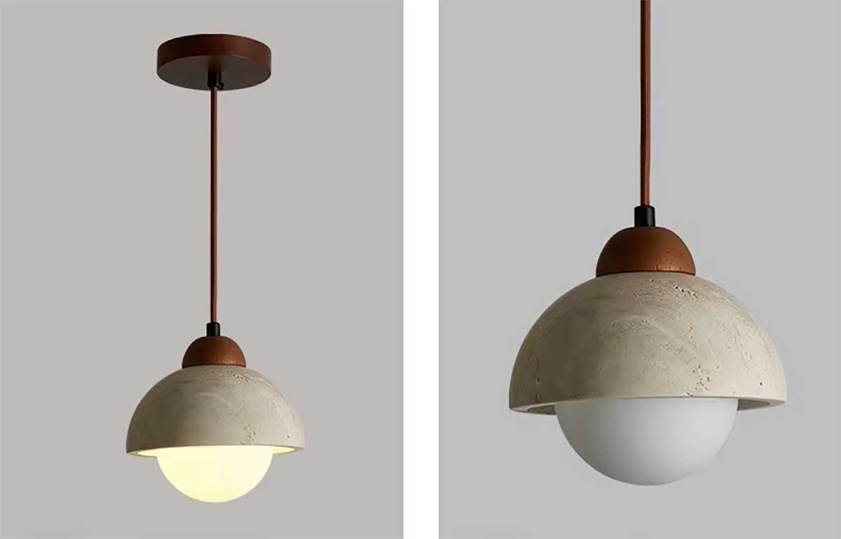 Its compact format makes it perfect as a pendant bedside lamp, above a bedside table, a reading corner or a small dining room. Thanks to the natural variations of travertine, each piece is unique and accentuates the artisanal and bohemian character of the lamp.